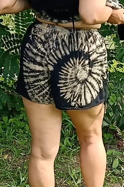 Tie Dye Shorts with loose baggy fit, one size fits most. Made of 100% cellulose rayon fabric with no spandex, so the fabric does not stretch like our Yoga Shorts and Ruffle Shorts. With an elastic waist band they fit a wide variety of sizes and shape. Adjustable pull string cinch sides for personalized fit/length.
