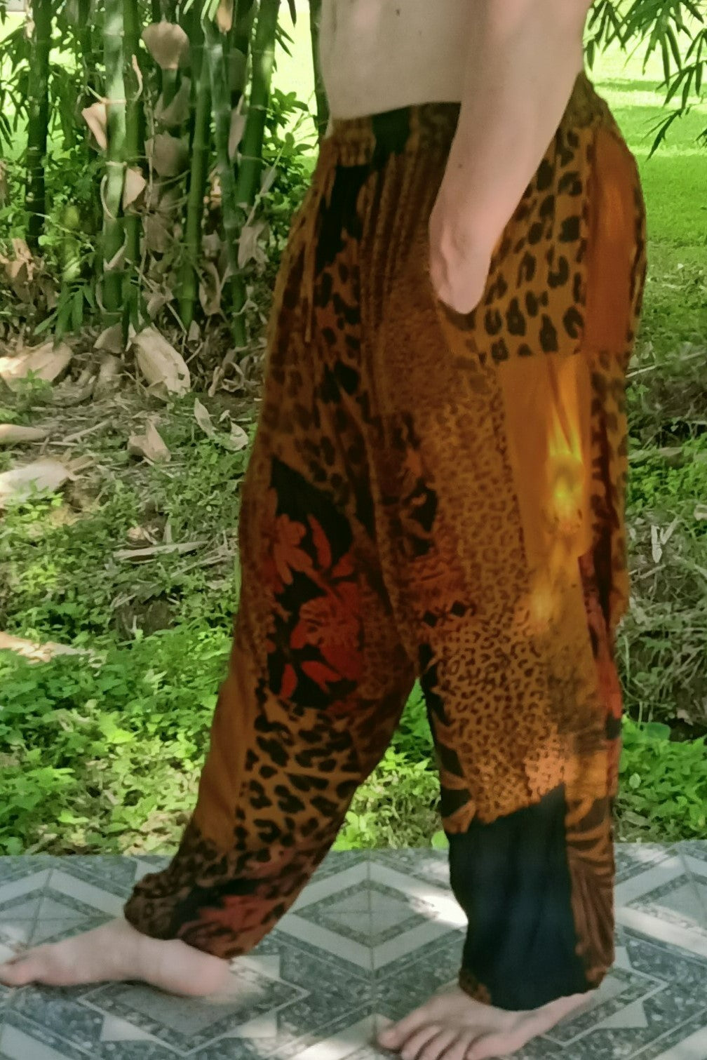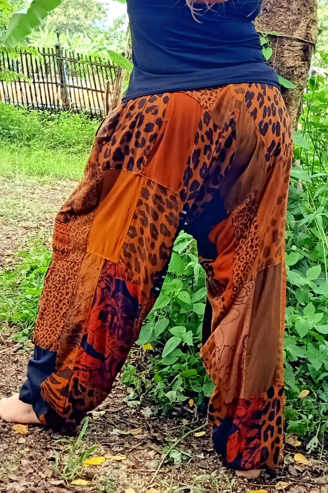 Patchwork Jogger Pants handmade of 100% rayon patchwork fabric. Each pair slightly different and unique. Available in Brown, Green, Blue and Purple. With elastic/drawstring waist and elastic ankles with two side pockets these gender neutral pants look amazing on everyone. Slight drop crotch makes them perfect for yoga, movement, festivals, everyday life and everything in between.