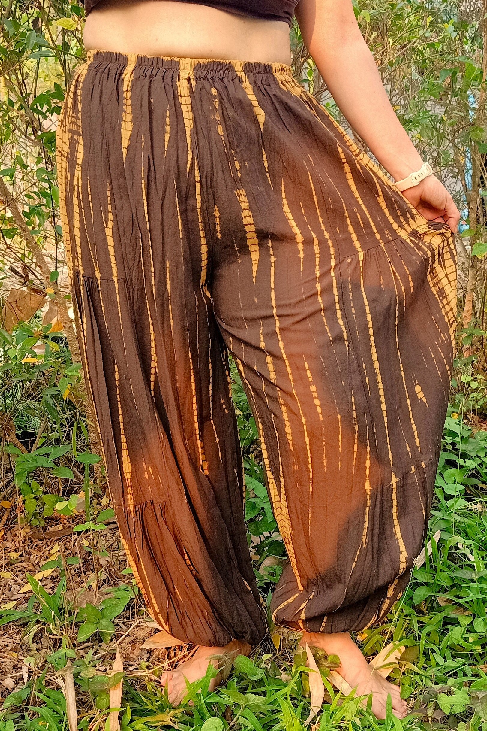Loose and baggy harem pant joggers have a gender neutral design, perfect for movement and everyday. Each pair hand tied and dyed, for unique pattern. Ethically made of 100% silky cellulose rayon fabric.