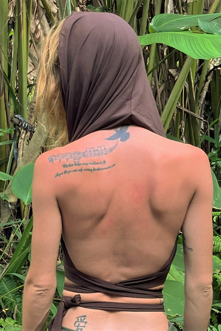 Backless festival hoody wrap top. Stretchy crop top with oversized neck that doubles as a hood. One size fits all XS-XL, all body types from short to tall and thinner to voluptuous big breasted goddesses. Adjustable style has wrap around tie. Responsibly handmade of sustainable fabric made of 90% tree pulp viscose with 10% spandex. This slow fashion garment is made to match our Skirt Collection to create stunning outfits.
