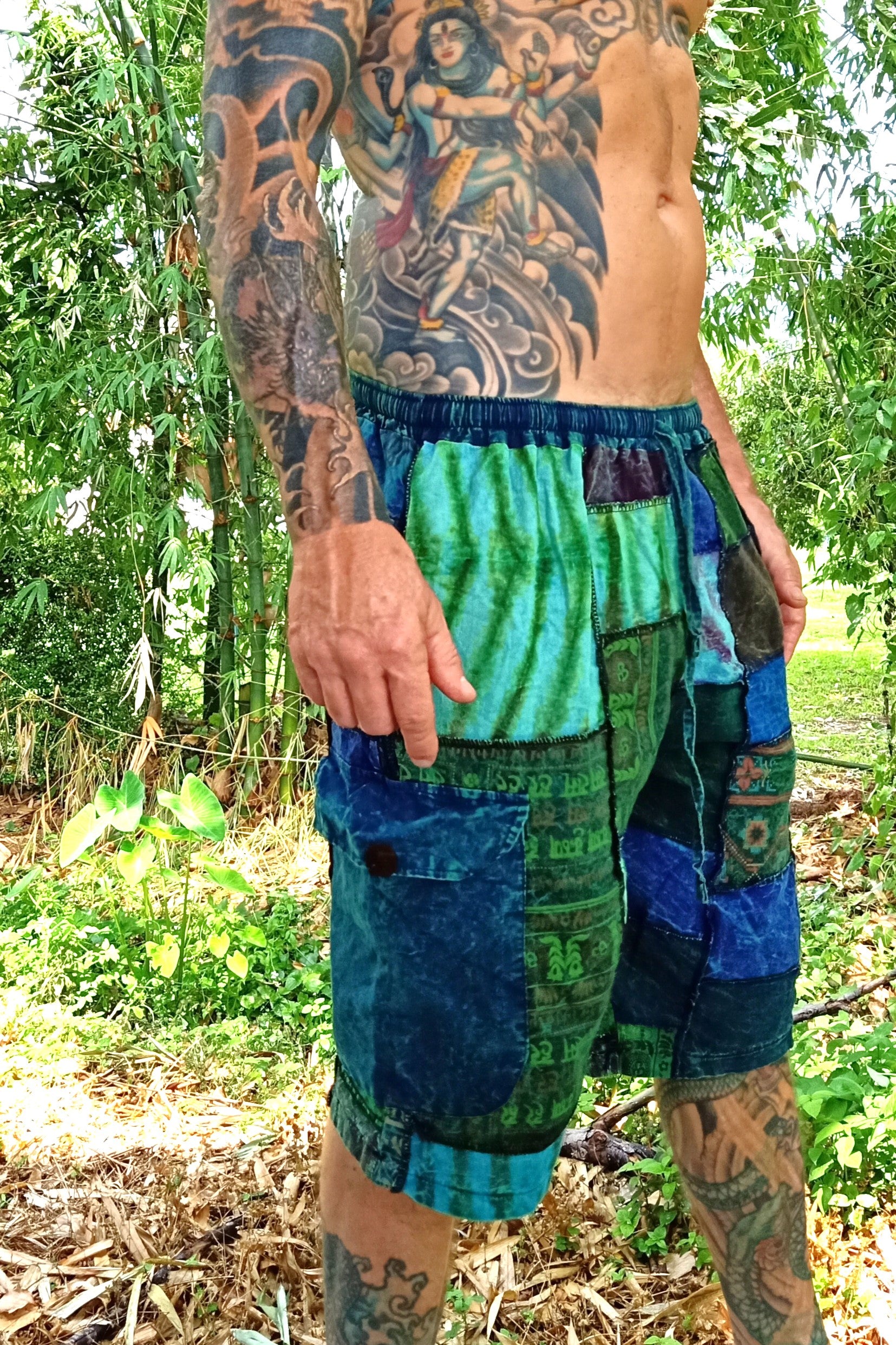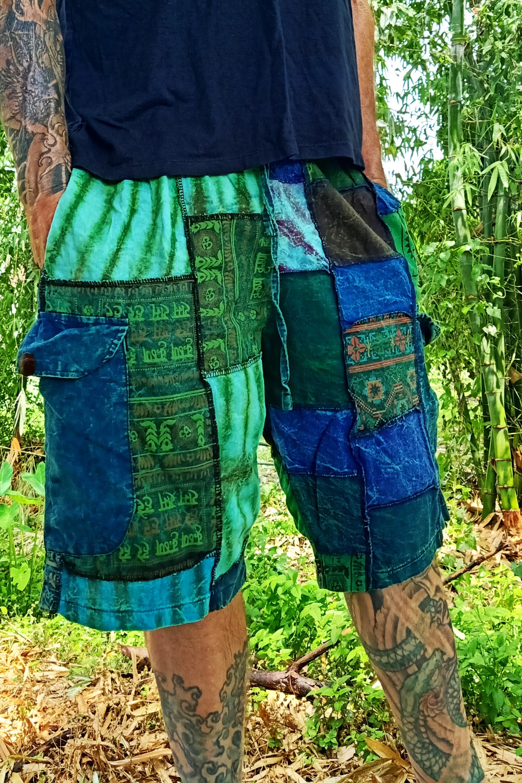 Patchwork Shorts handmade of 100% cotton patchwork fabric. Each pair slightly different and unique. With elastic/drawstring waist with two side pockets and 2 cargo pockets. Baggy and comfortable, lightweight and breathable. Pick the color of the cargo pockets. Each pair slightly different and unique. Will be similar to photos.