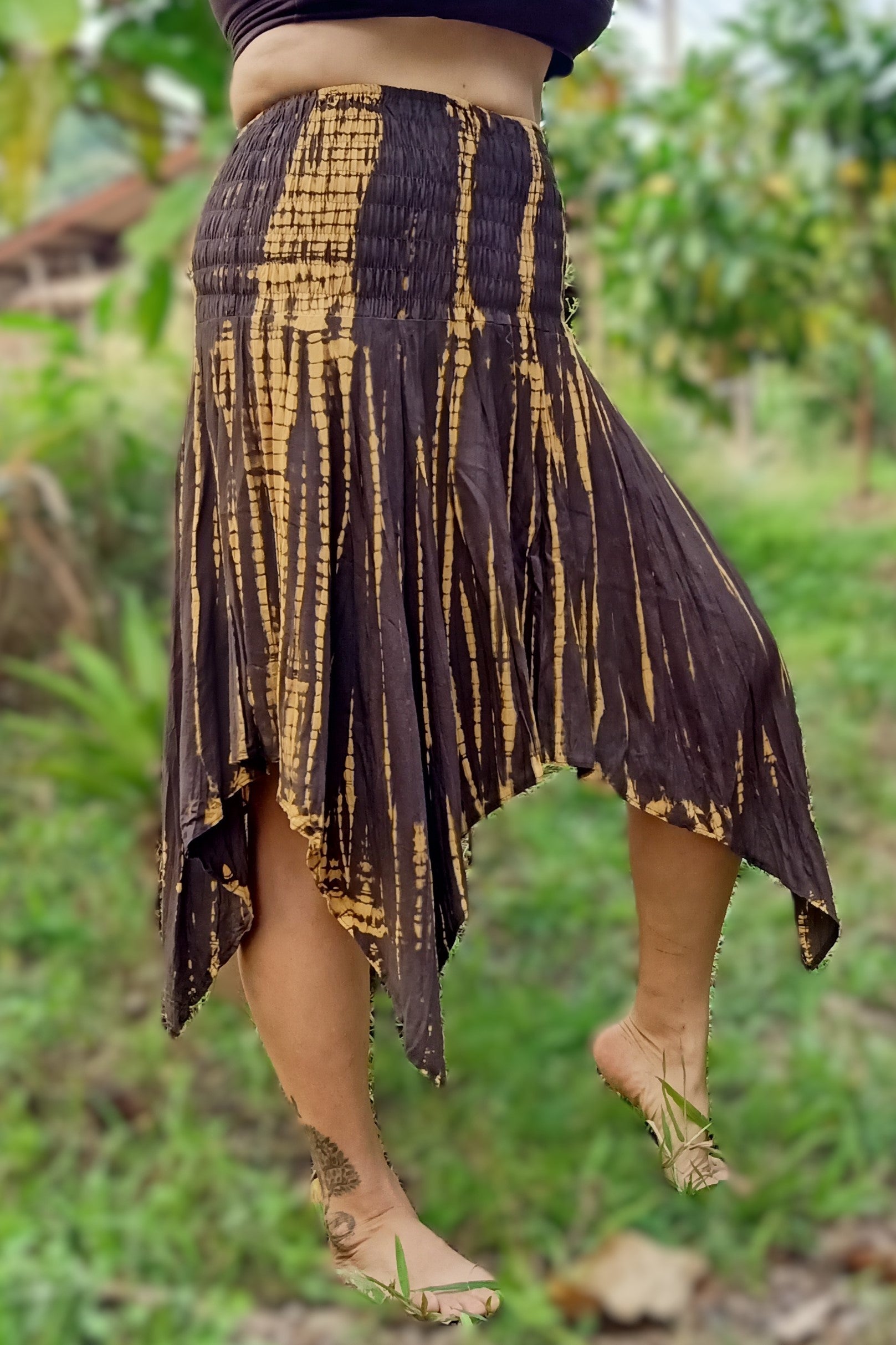 Made of soft breathable 100% plant-based cellulose Rayon fabric these skirts are a perfect for forest fairy types. Each one hand cut, hand sewn, hand tied and hand dyed. Will be similar to photos. Dark brown color with golden vertical streaks tie dyed.