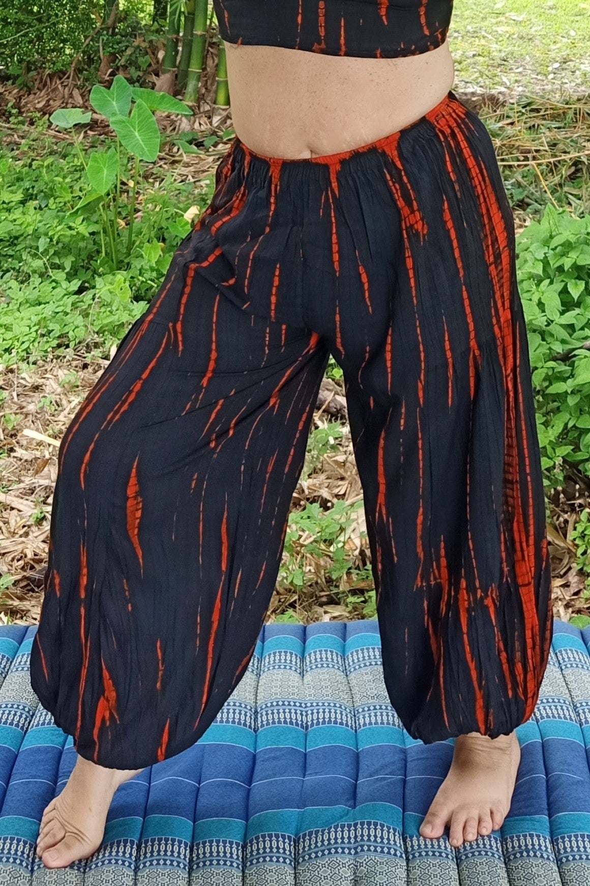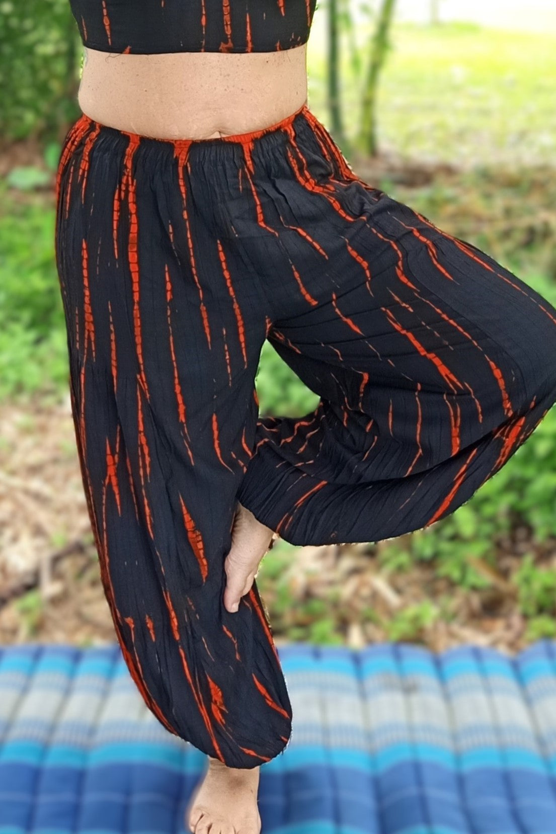Loose and baggy harem pant joggers have a gender neutral design, perfect for movement and everyday. Each pair hand tied and dyed, for unique pattern. Ethically made of 100% silky rayon fabric. Matching tops available in our new Island Collection.