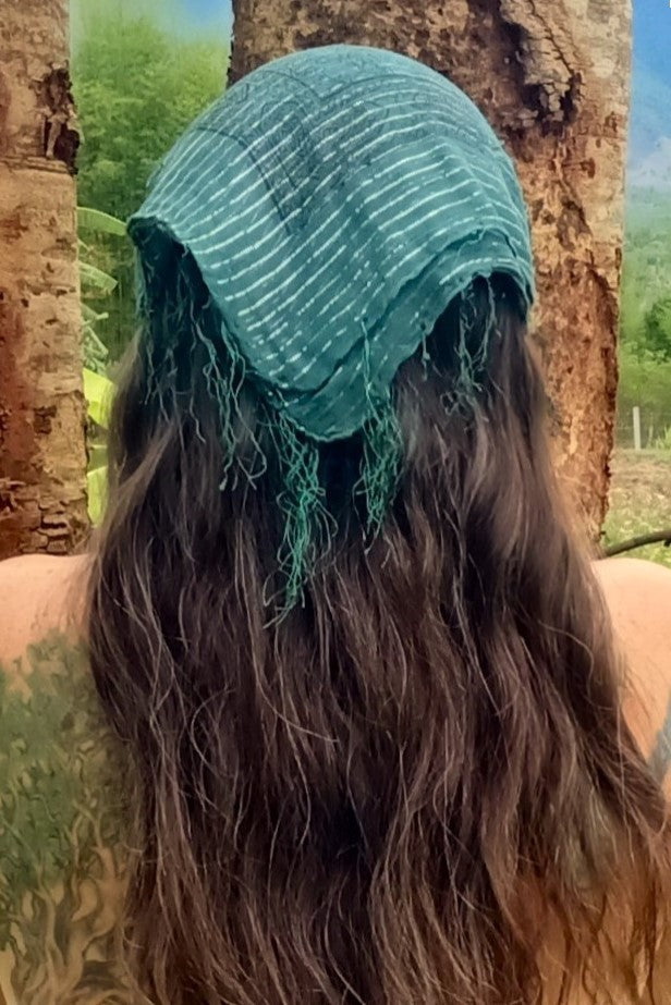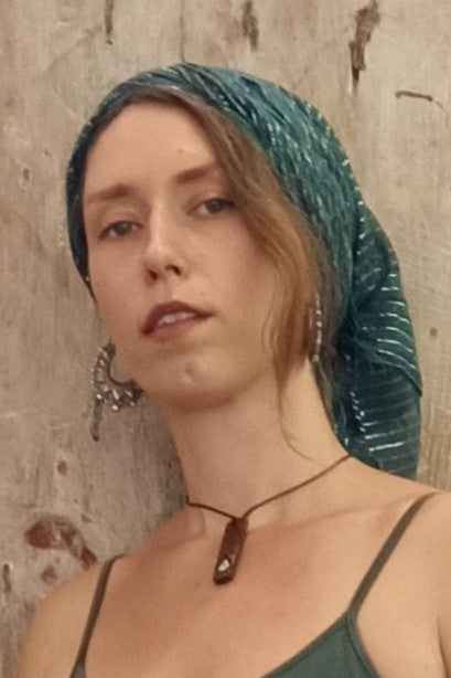 Our Green Head Wrap Scarf with silver glitter threads 3'x3' square (38"x38") with fringe along edges is a deep forest green shade perfect for nature loving hippie mamas.
