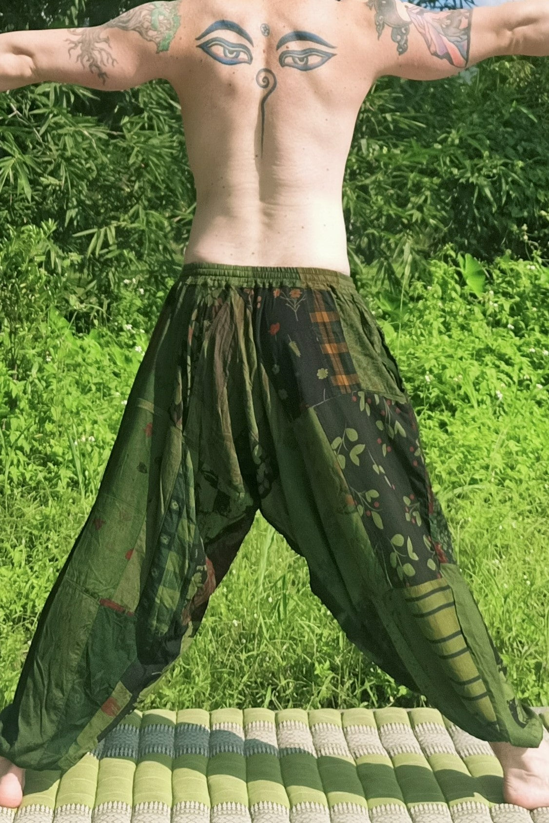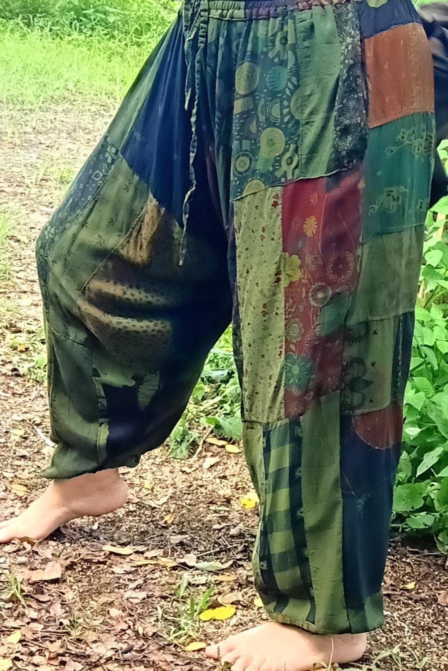 Patchwork Jogger Pants handmade of 100% rayon patchwork fabric. Each pair slightly different and unique. Available in Brown, Green, Blue and Purple. With elastic/drawstring waist and elastic ankles with two side pockets these gender neutral pants look amazing on everyone. Slight drop crotch makes them perfect for yoga, movement, festivals, everyday life and everything in between.