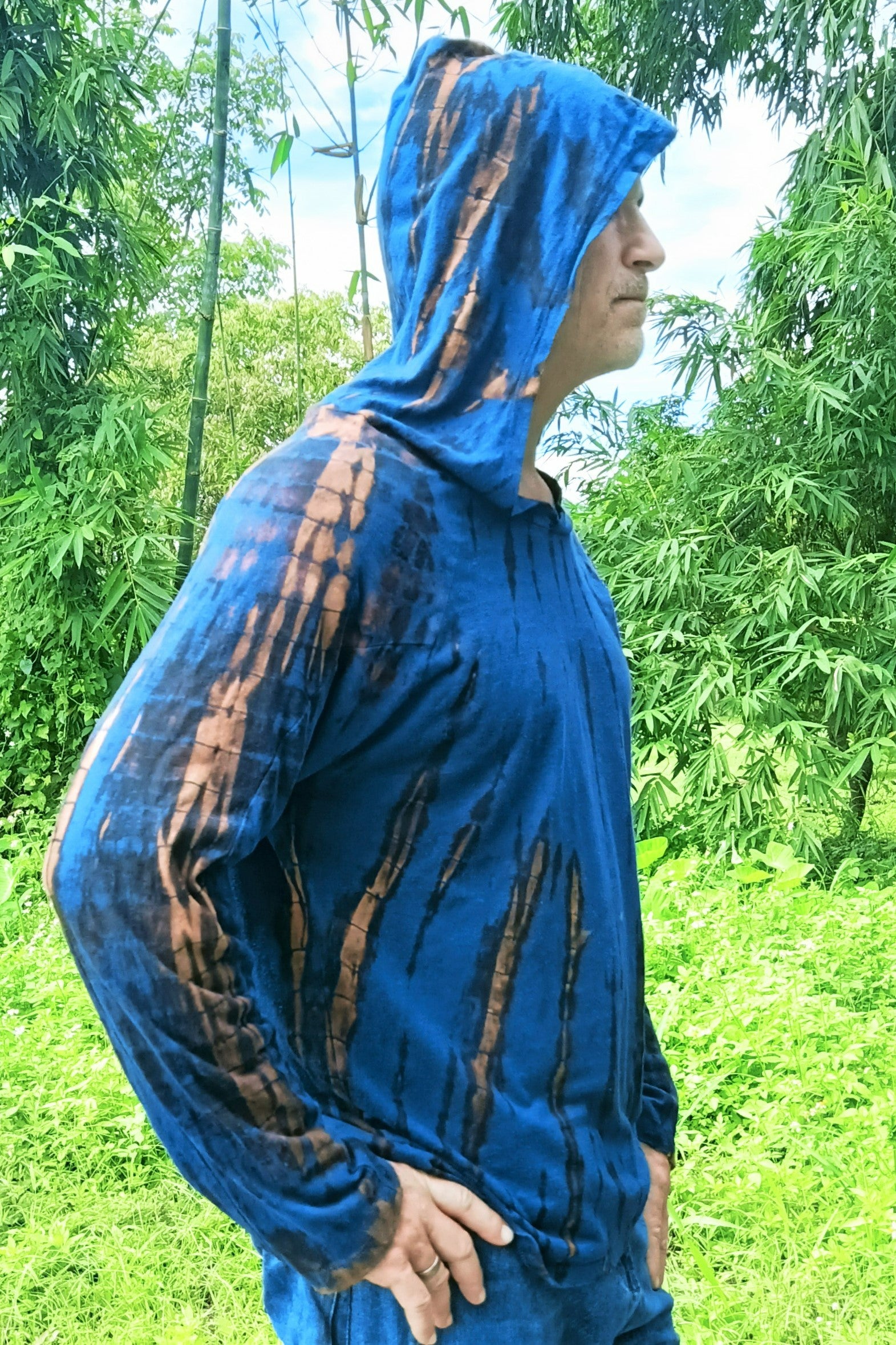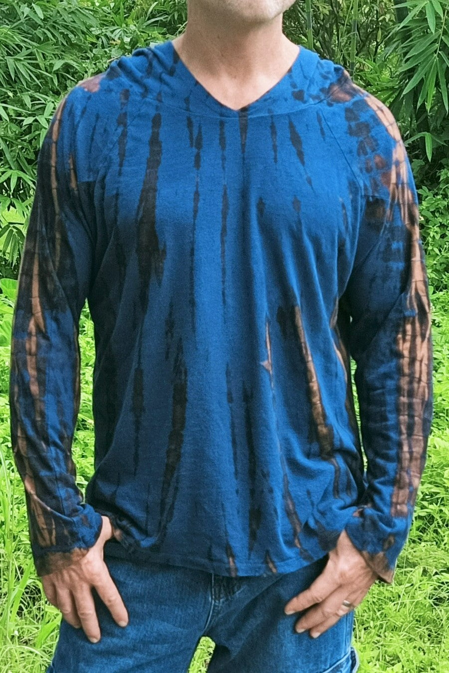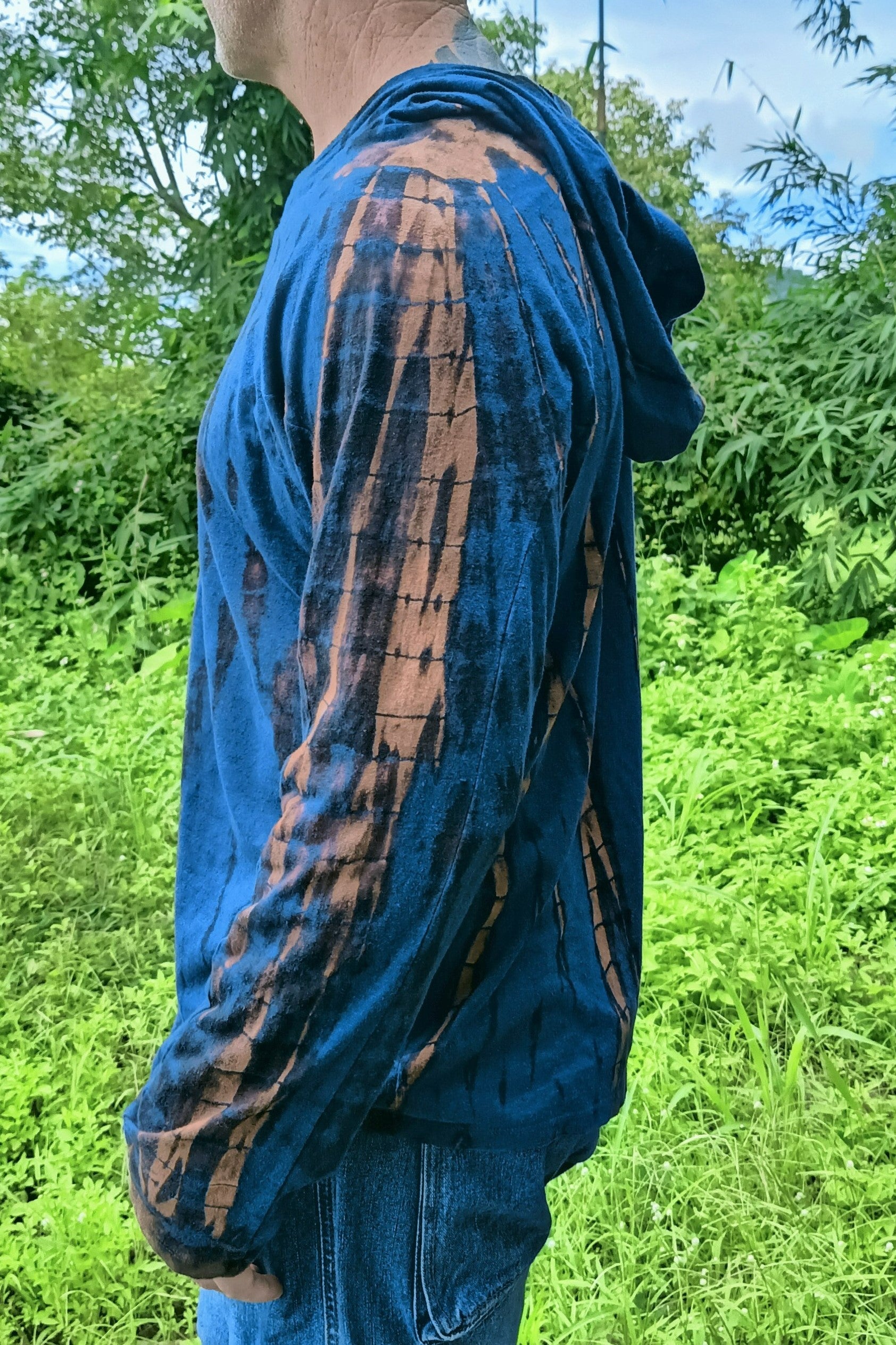 Gender neutral long sleeve hoody in Indigo Earth tie dye is blue with brown streaks.