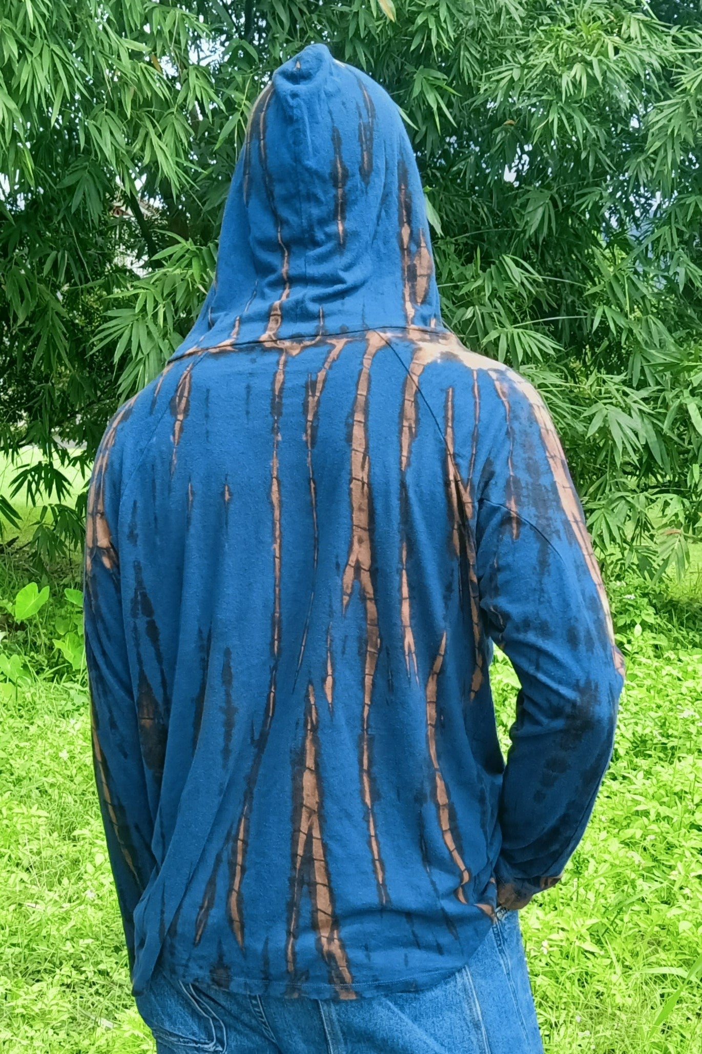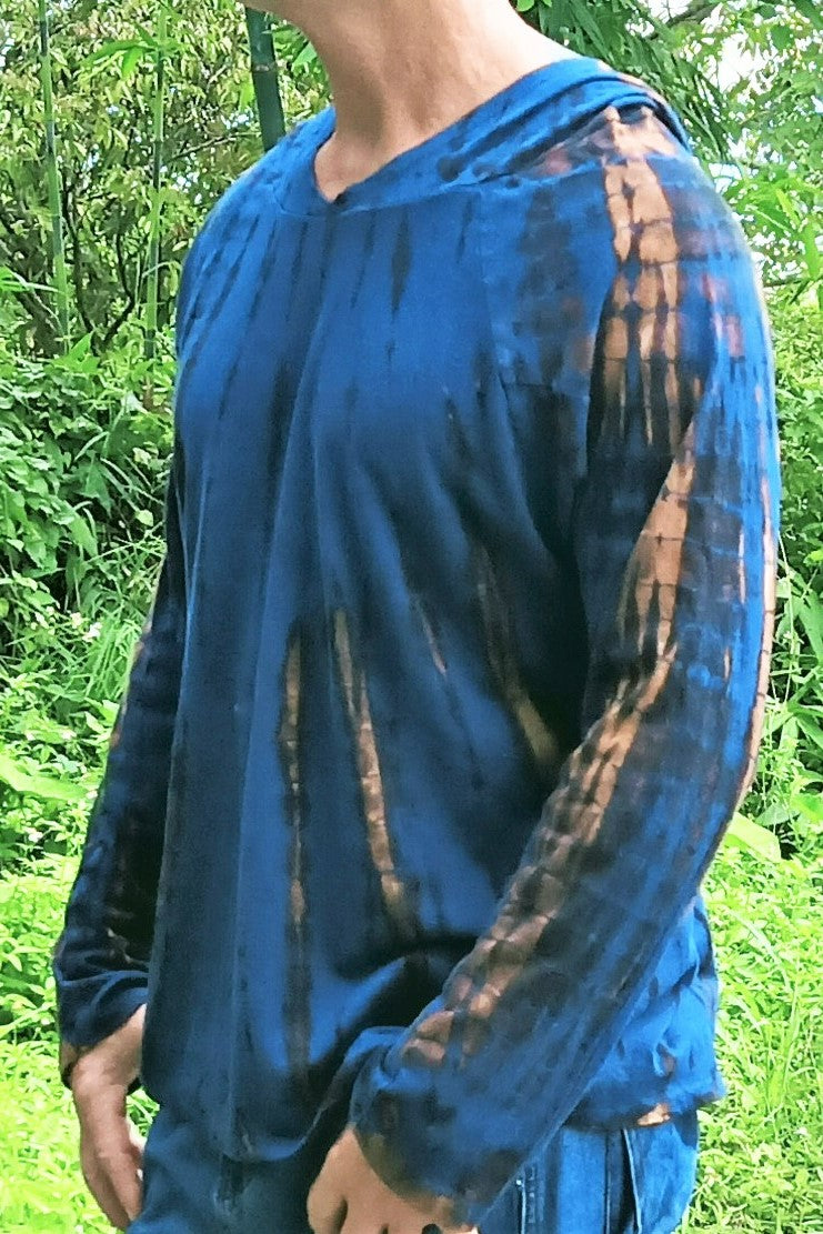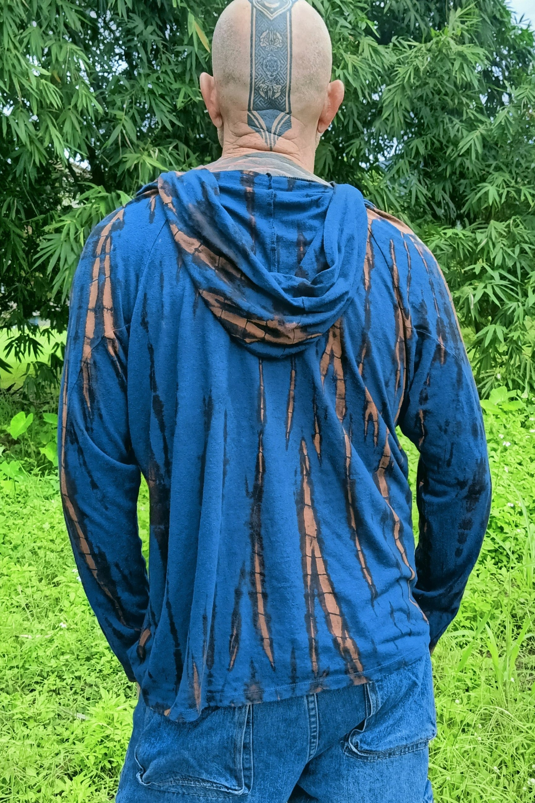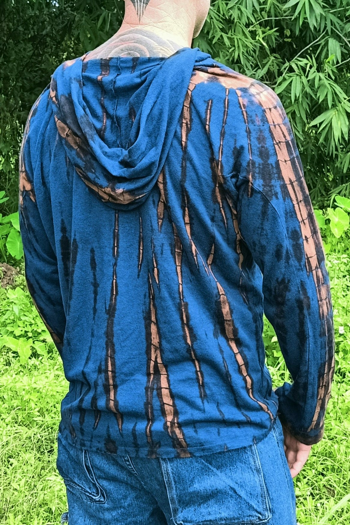 Gender neutral long sleeve hoody in Indigo Earth tie dye is blue with brown streaks.