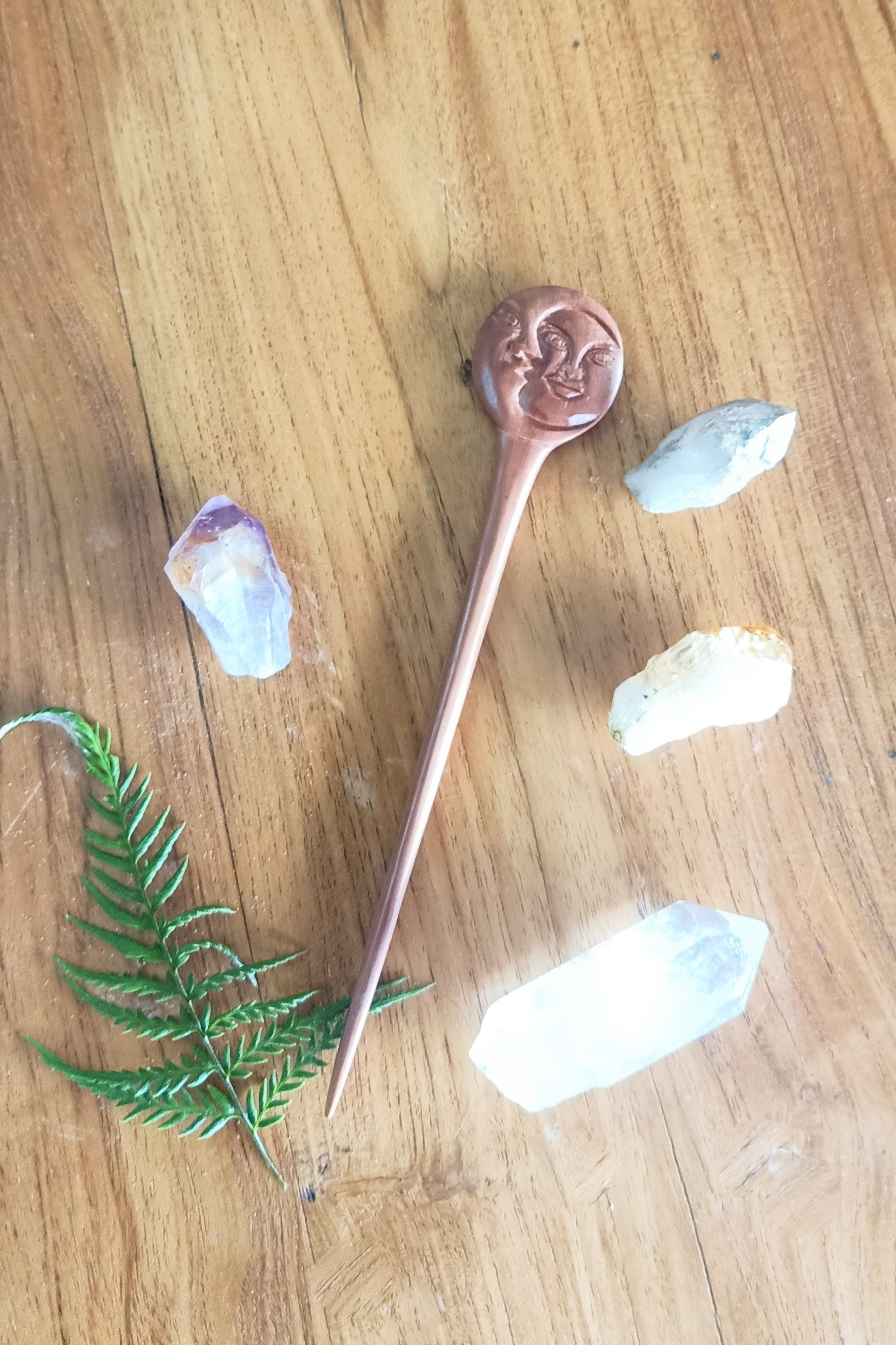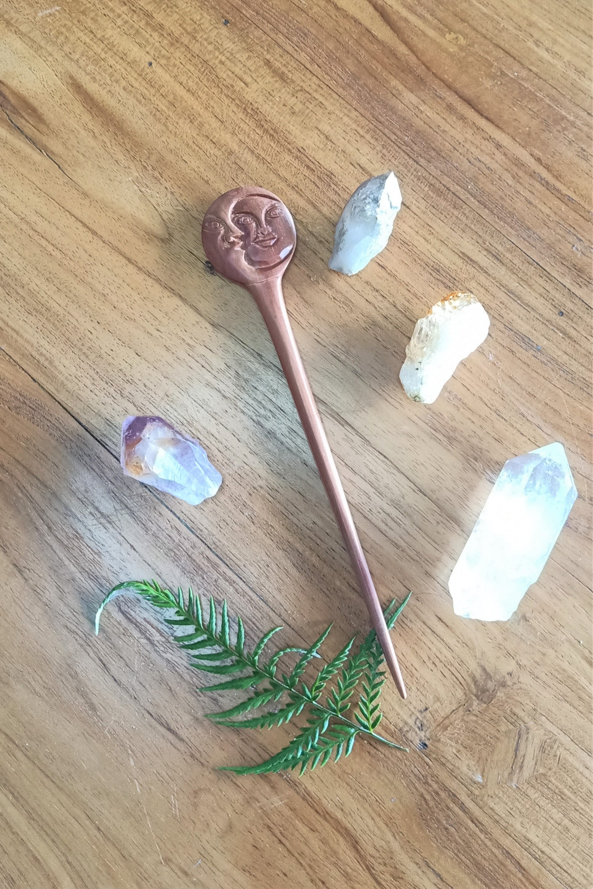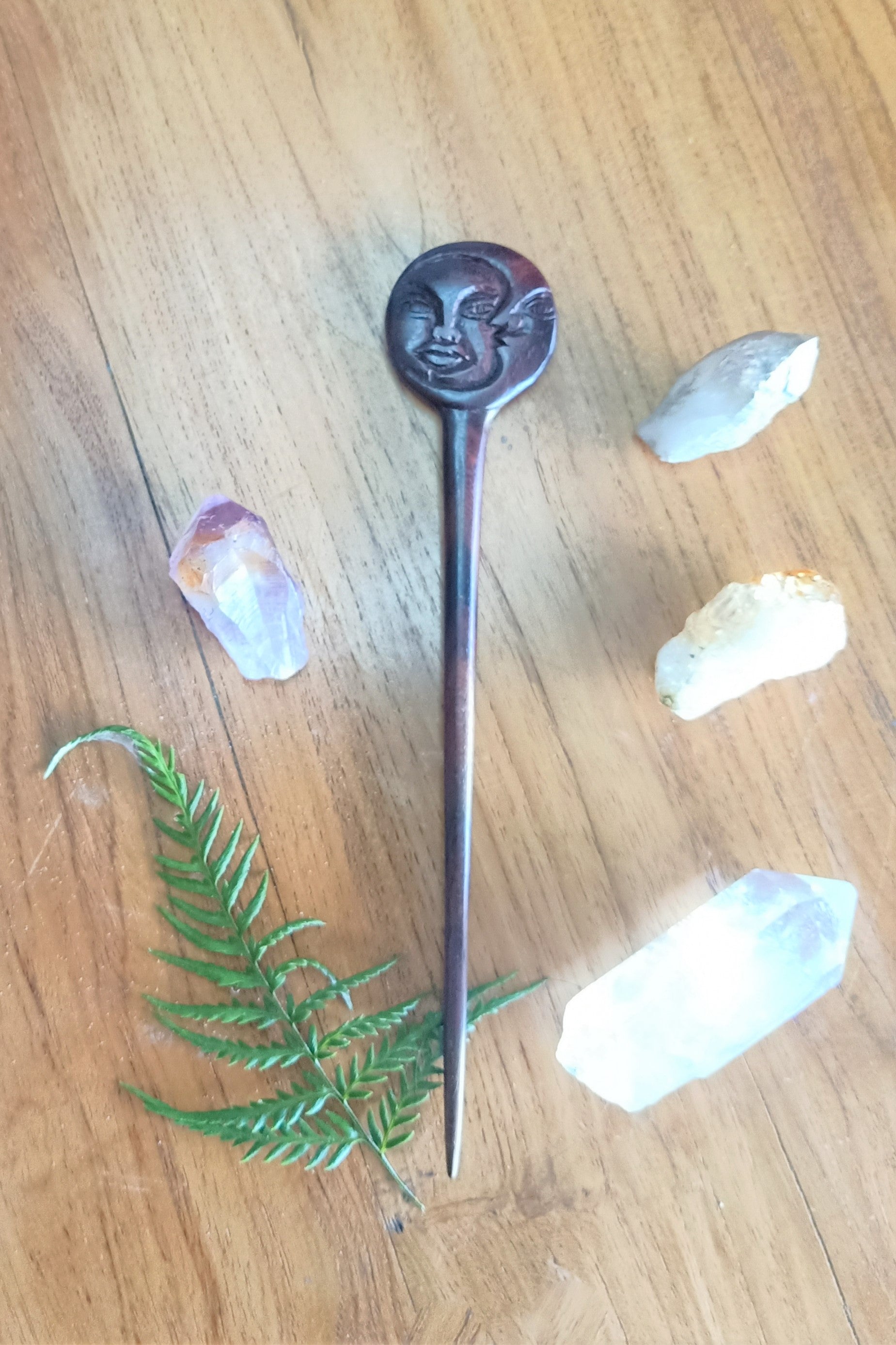 Wooden Moon Phases Hair Sticks are intricately carved with both a full moon and crescent moon on both sides, fully reversible, beautiful handmade and artistic.