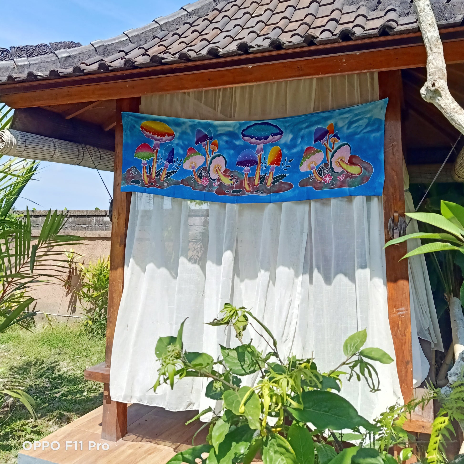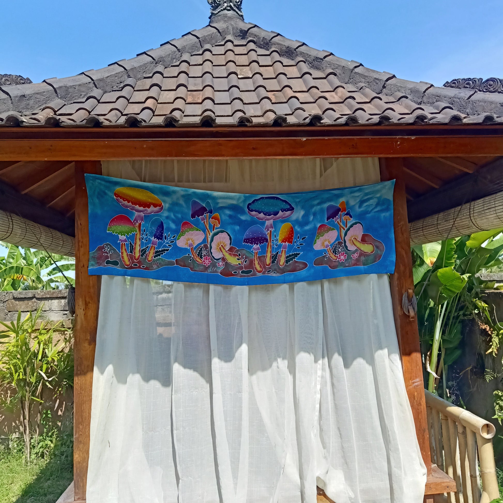 Handmade with traditional Indonesian batik process by a local artisan on the island of Bali. The Batik process, also known as wax resist dyeing, is an ancient art form using wax and dye to create the designs. It is slow and laborious and each wall hanging is truly a work of art.