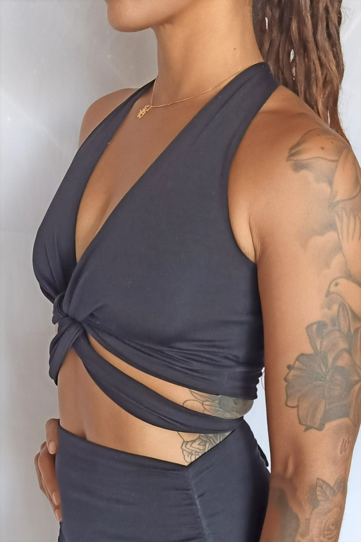 Onyx DewDrop Wrap Halter Top available in S/M or L/XL.