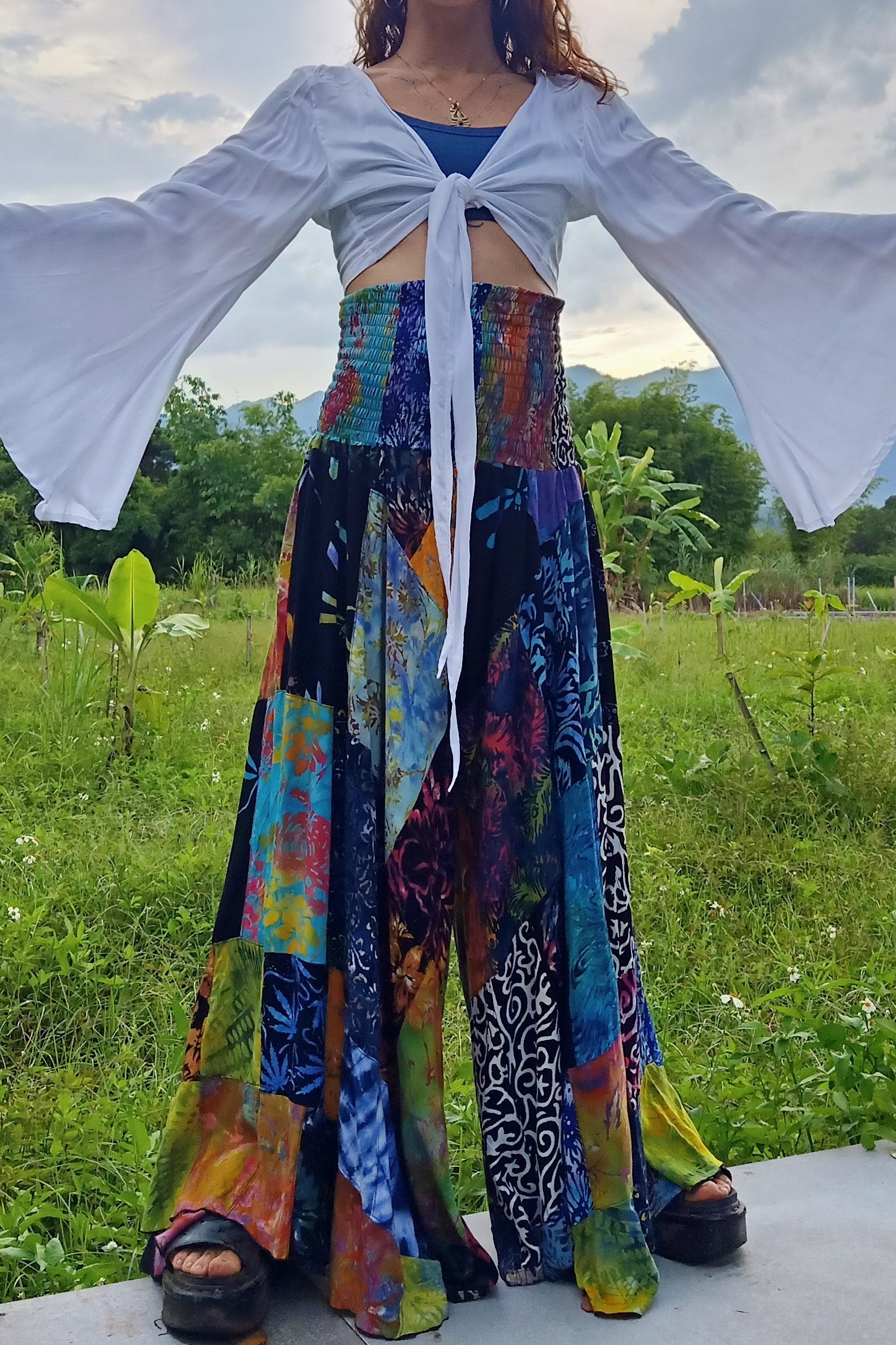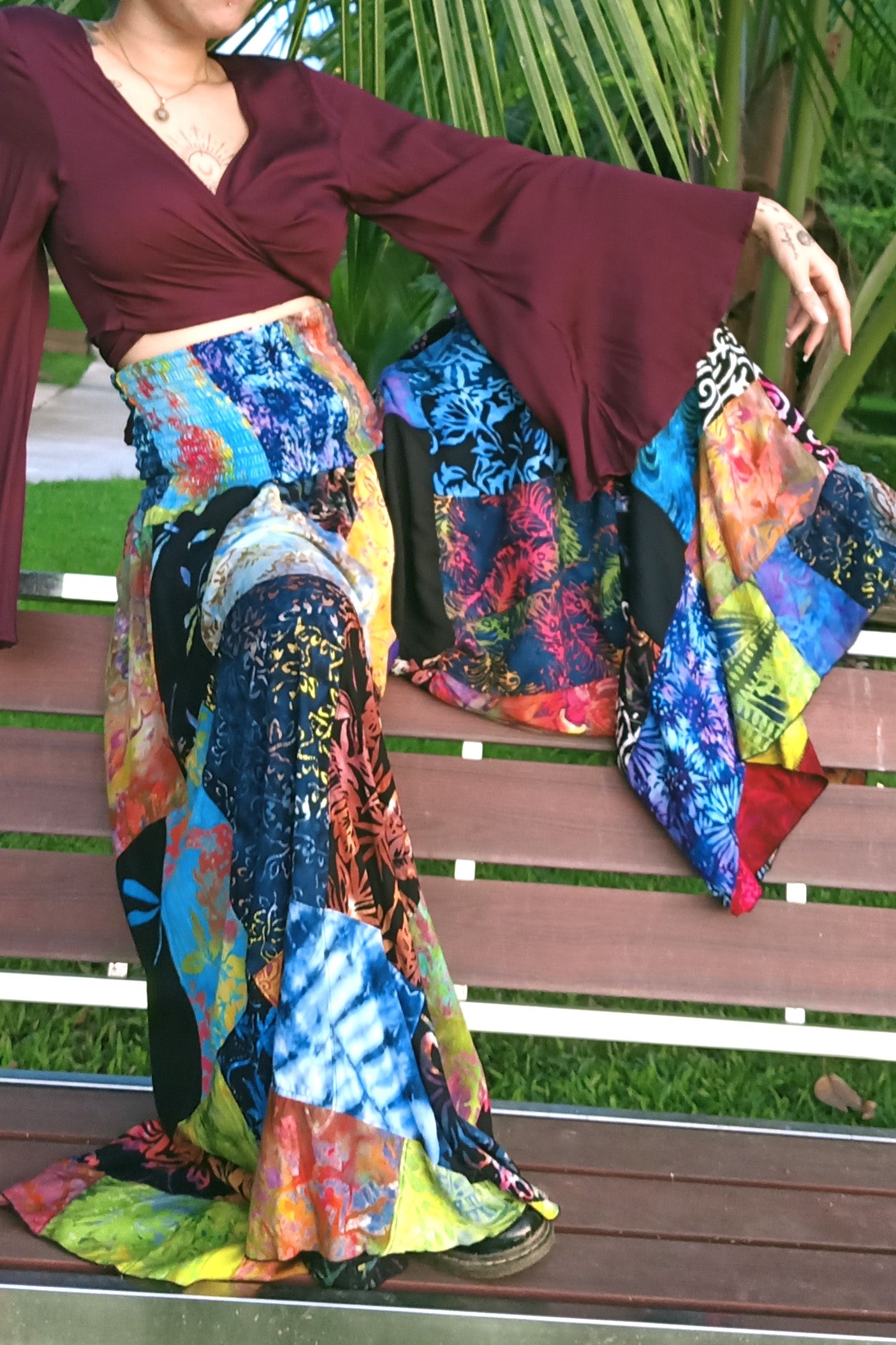 Long and extra big Palazzo Bell Bottoms made of 100% Rayon Patchwork fabric.