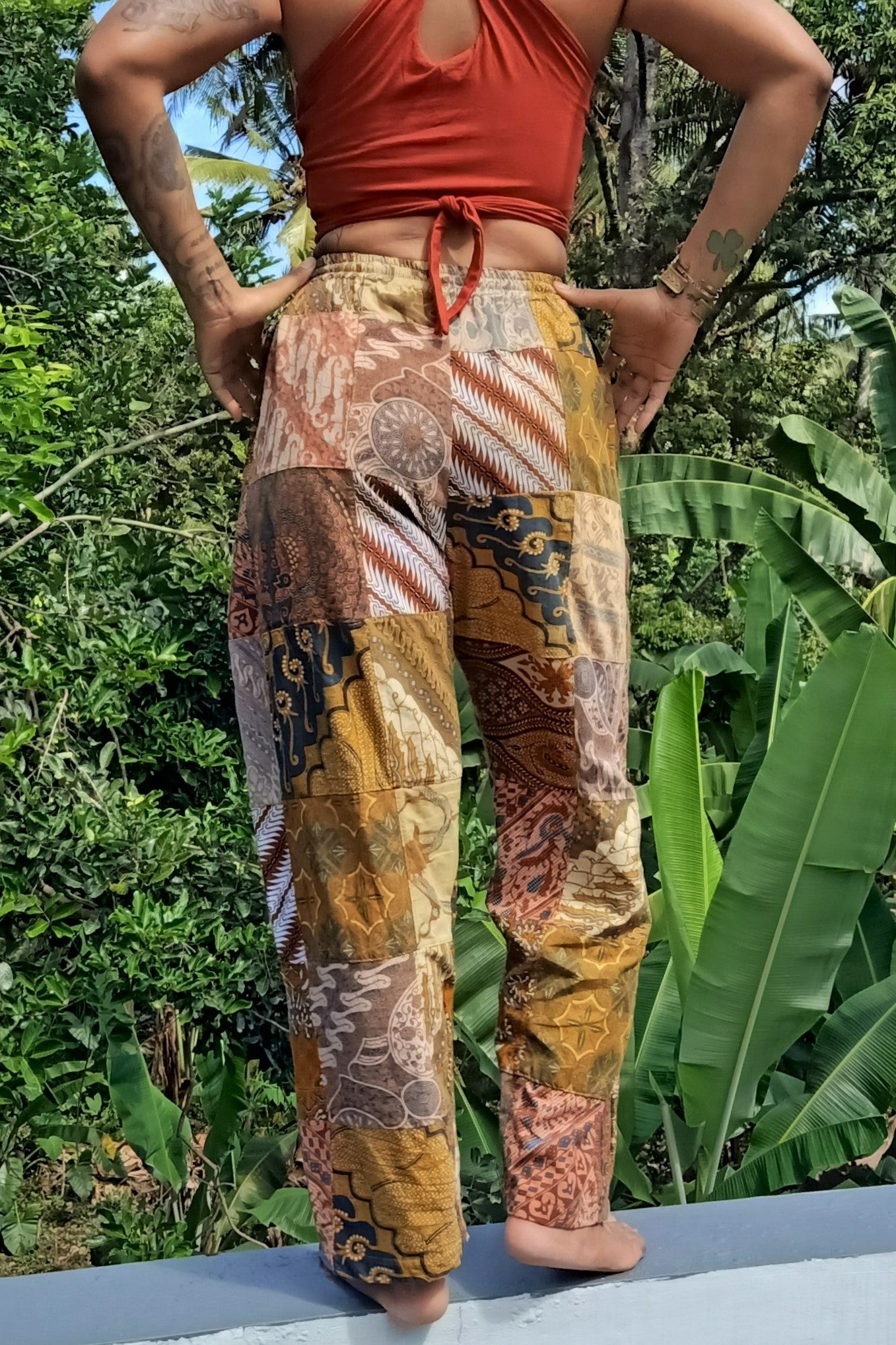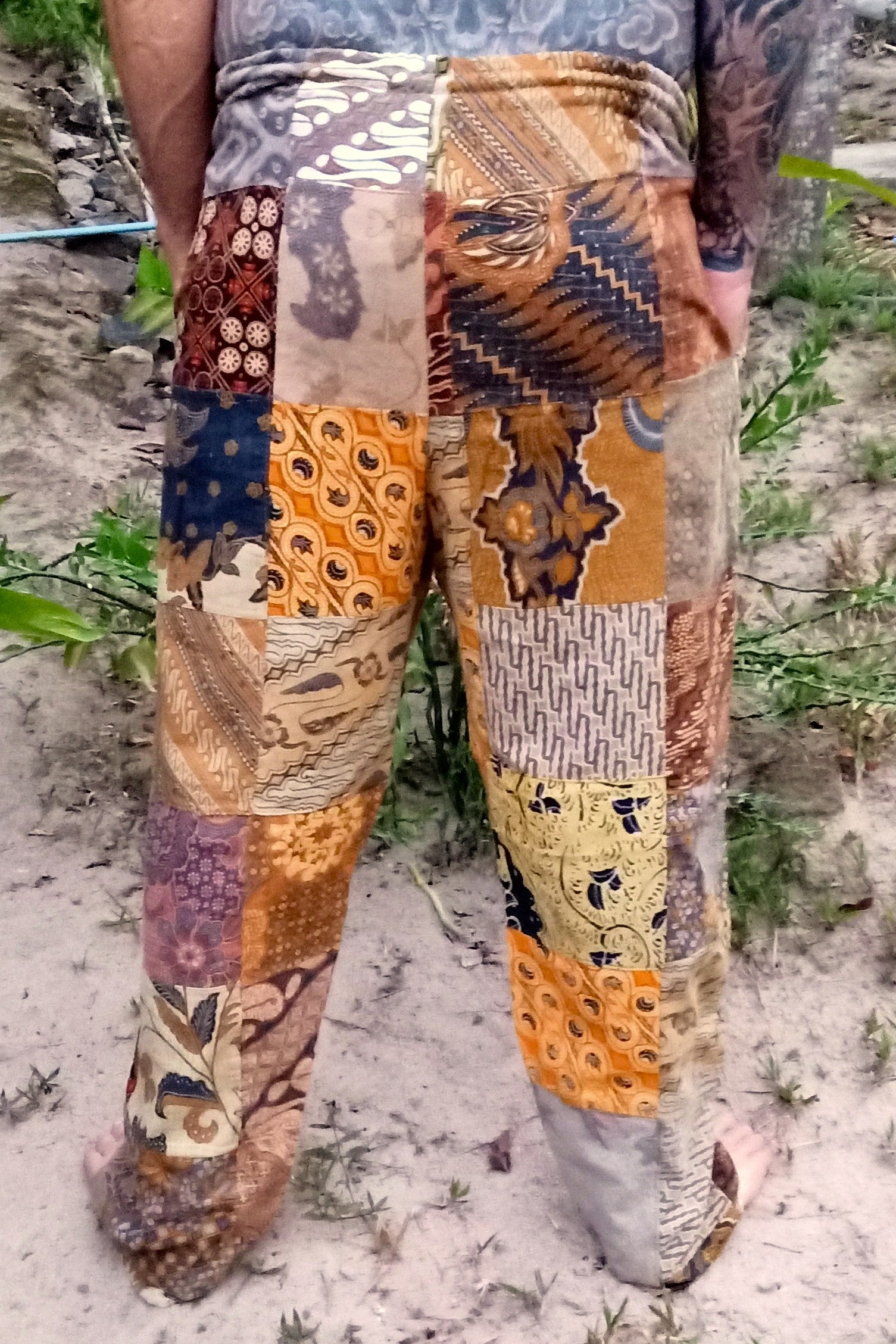 Patchwork Pants handmade of upcycled 100% cotton patchwork fabric. Each pair slightly different and unique. Will be similar to photos. Available in natural brown tones, or with green, purple or blue highlights. With elastic/drawstring waist and two side pockets these gender neutral pants look amazing on everyone.