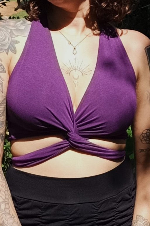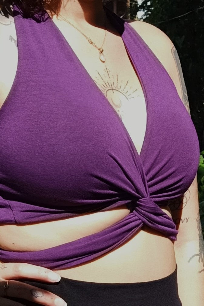 Plum DewDrop Wrap Halter Top available in S/M or L/XL. Purple top with multiple ways to wear, twisted, layer or tied in front, wrapped around back. Has almost as much support as a bra but more comfortable than any bra ever. With built in breast pocket for your own liner.