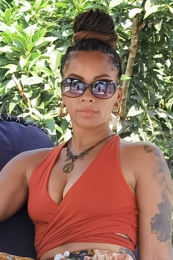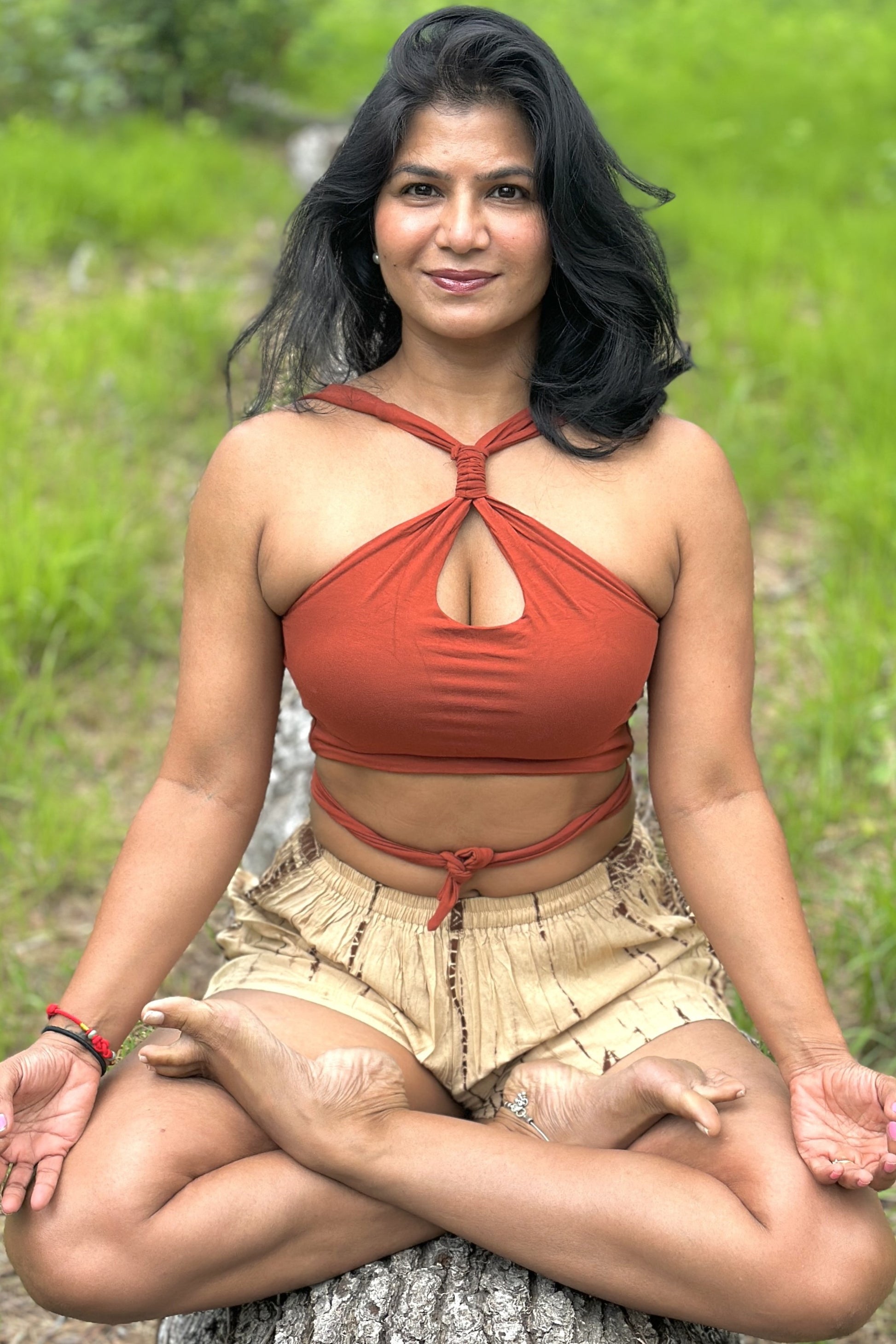 Rust DewDrop Wrap Halter Top available in S/M or L/XL.
