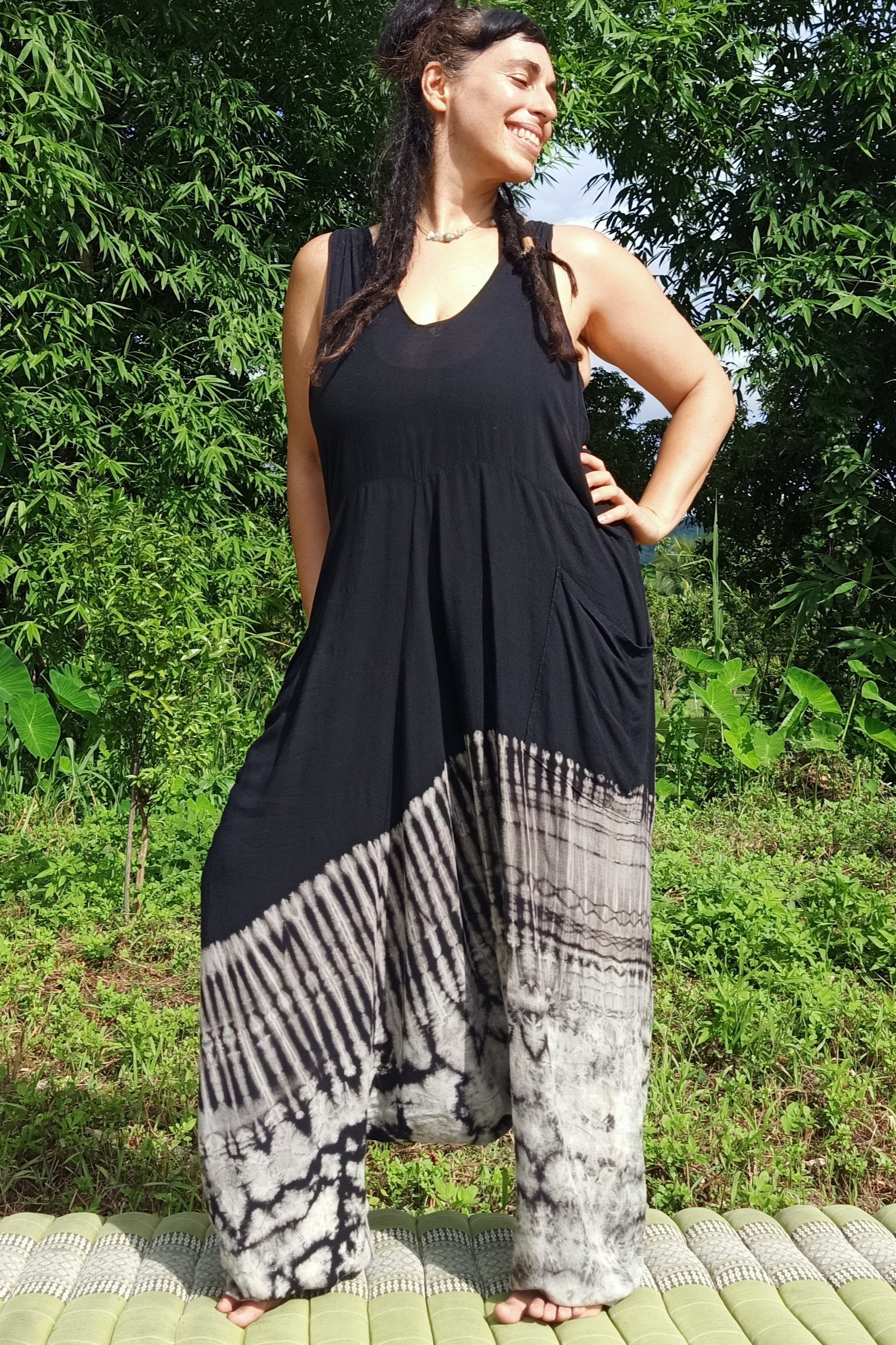 Tie Dye Jumpsuit Overalls made of silky cellulose rayon fabric come in one big baggy size fits most. Scrunchie on the back straps to adjust the fit. Add our Utility Pocket Belt for a different fit.