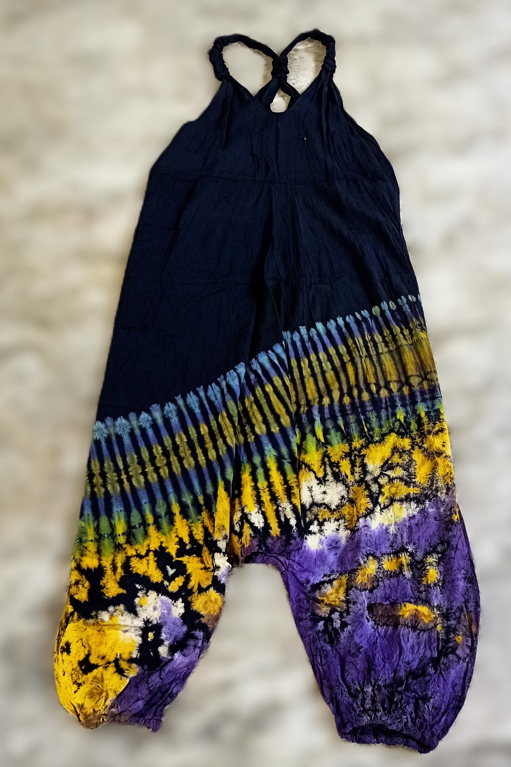 Tie Dye Jumpsuit Overalls made of silky cellulose rayon fabric come in one big baggy size that fits most people.