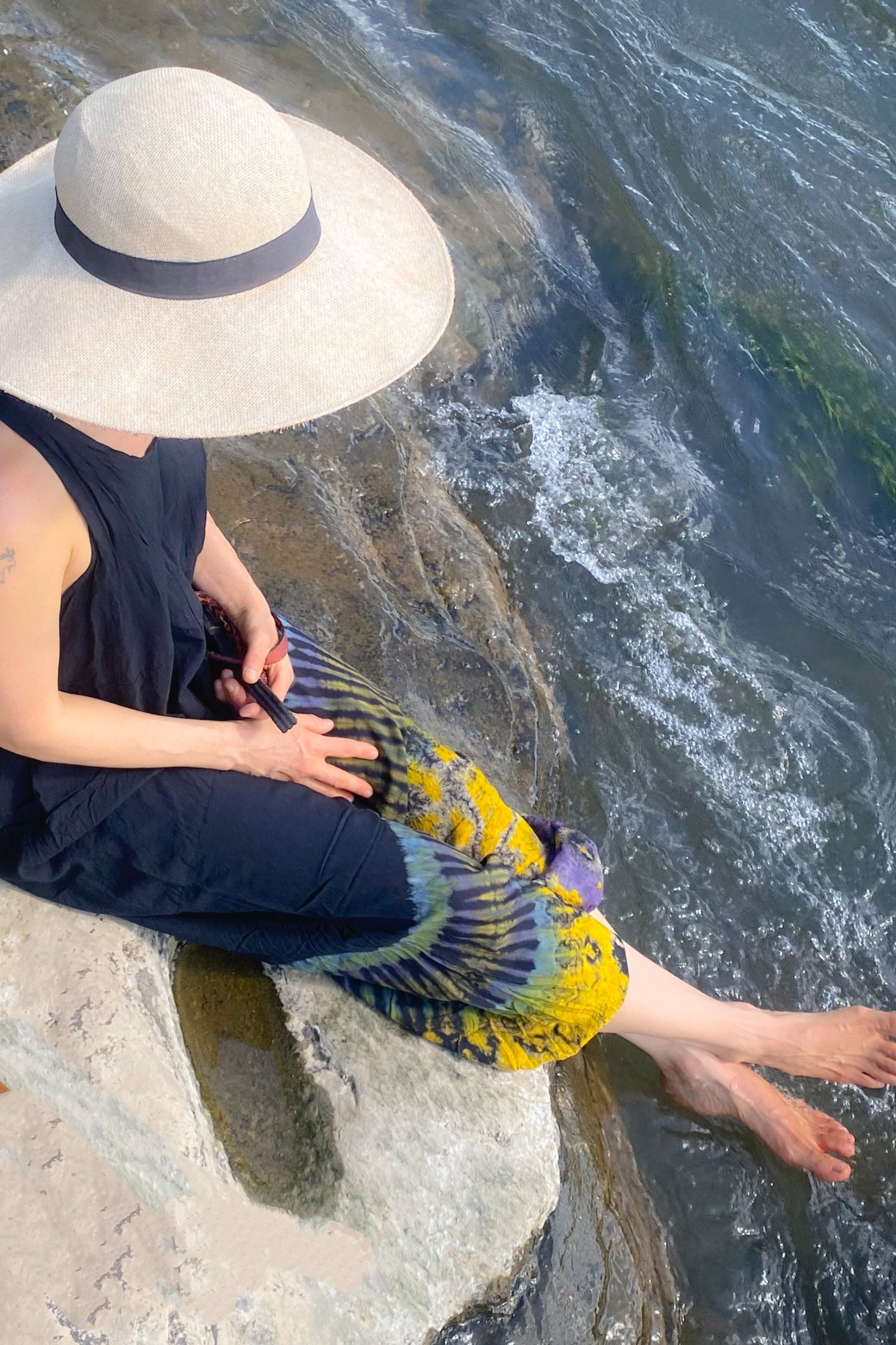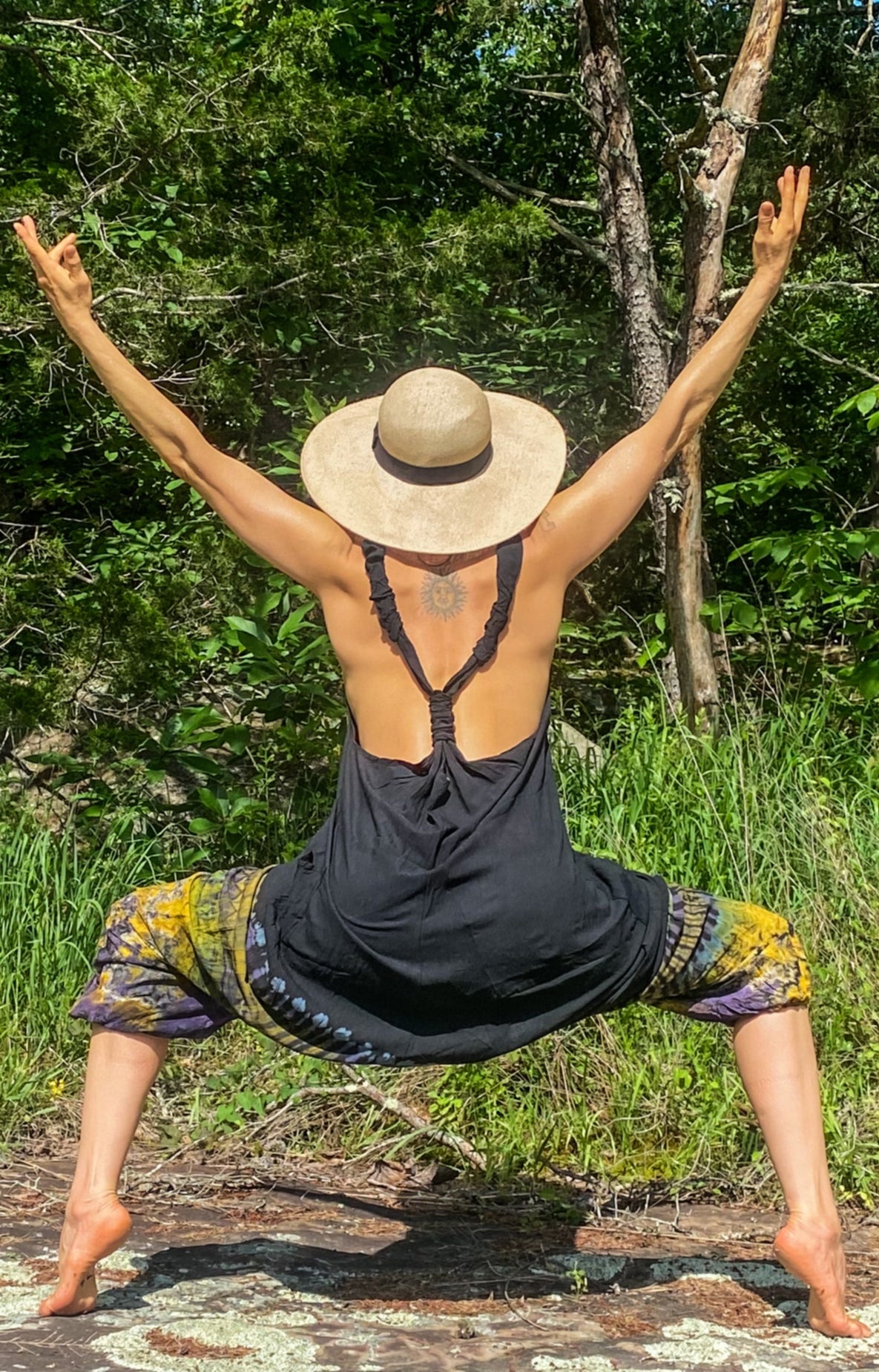 Solid black top with blue and yellow tie dye at bottom. Hand tied and dyed makes each one unique. Will be similar to photos.