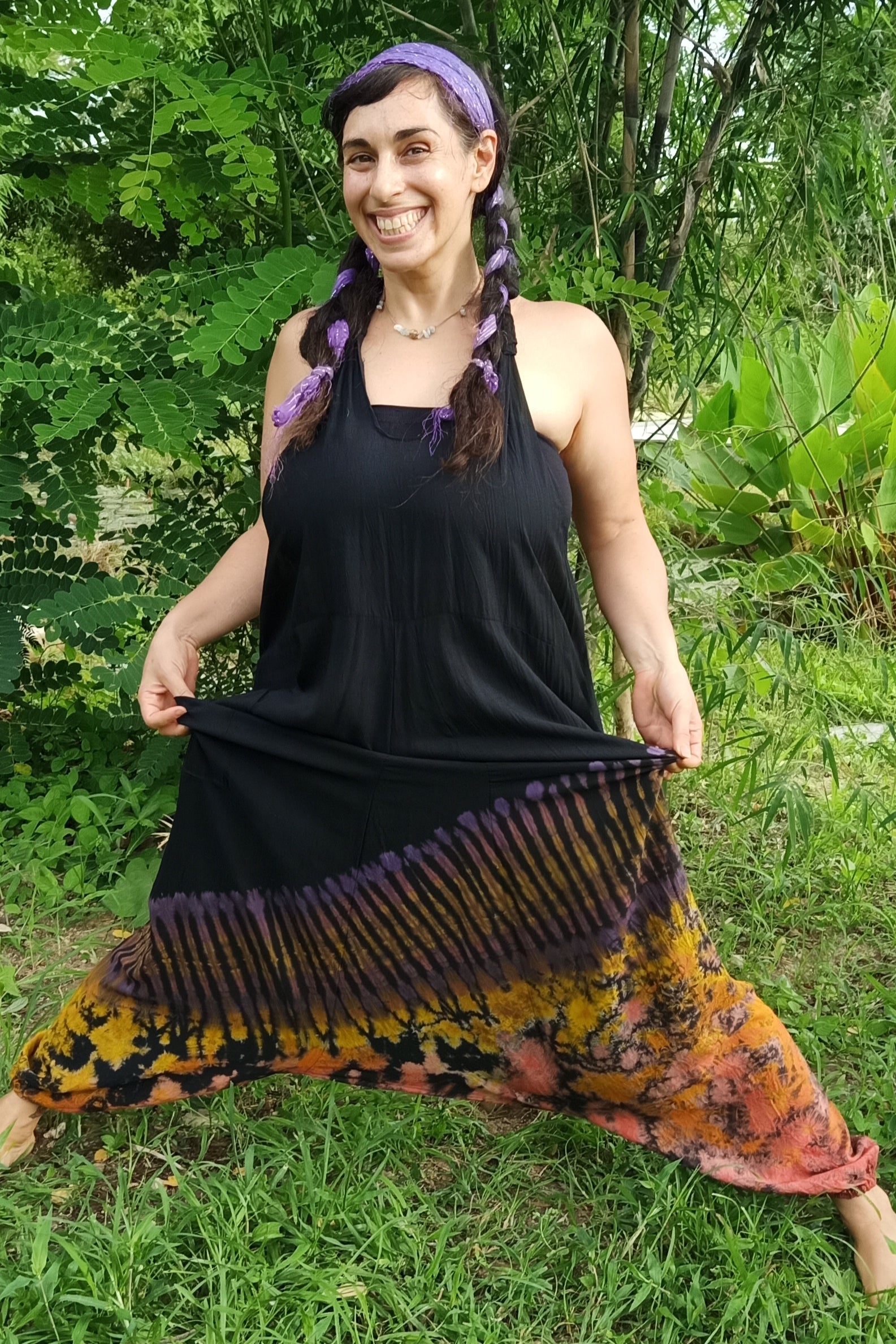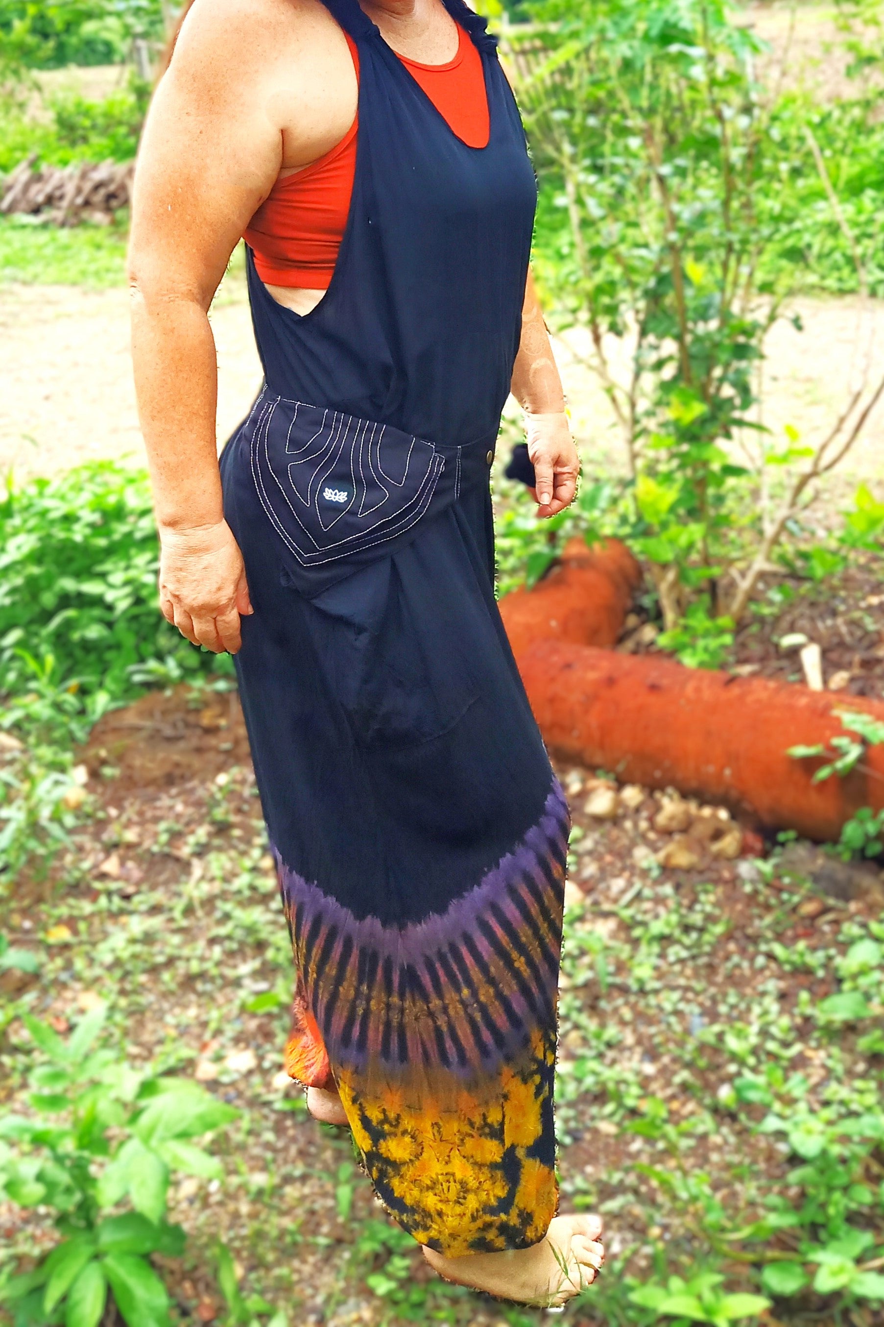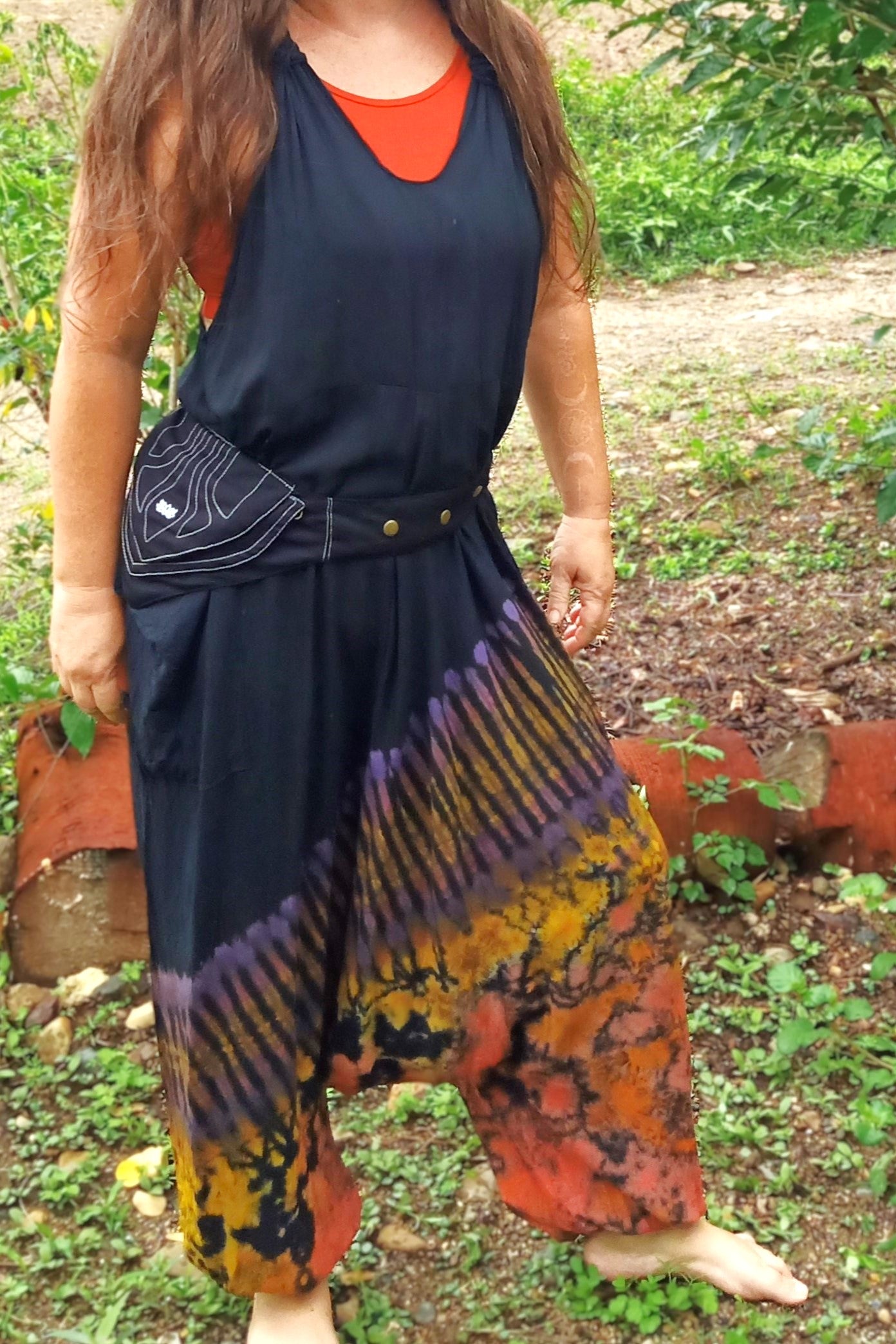 Tie Dye Jumpsuit Overalls made of silky cellulose rayon fabric come in one big baggy size fits most. Scrunchie on the back straps to adjust the fit. Add our Utility Pocket Belt for a different fit.